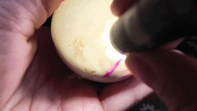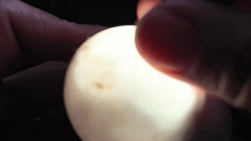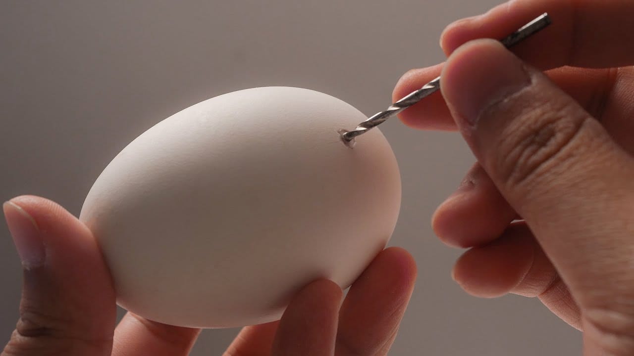 Image of a safety air hole being drilled in a goose egg, taken from a YouTube video.
