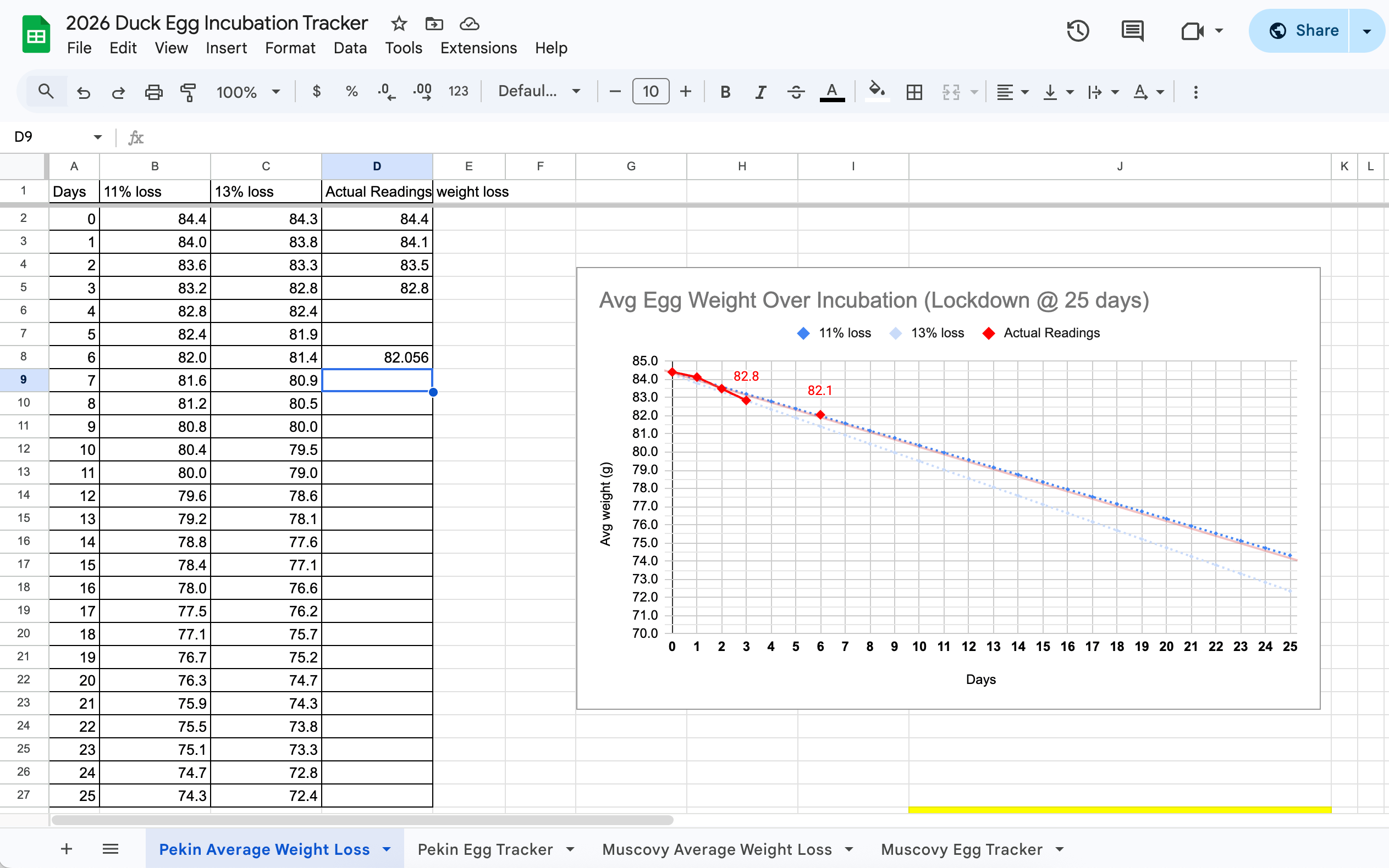 Chart of the Pekin eggs: Measurements showing that the rate of weight loss is currently within the 🥚eggceptable🥚 11–13% range.