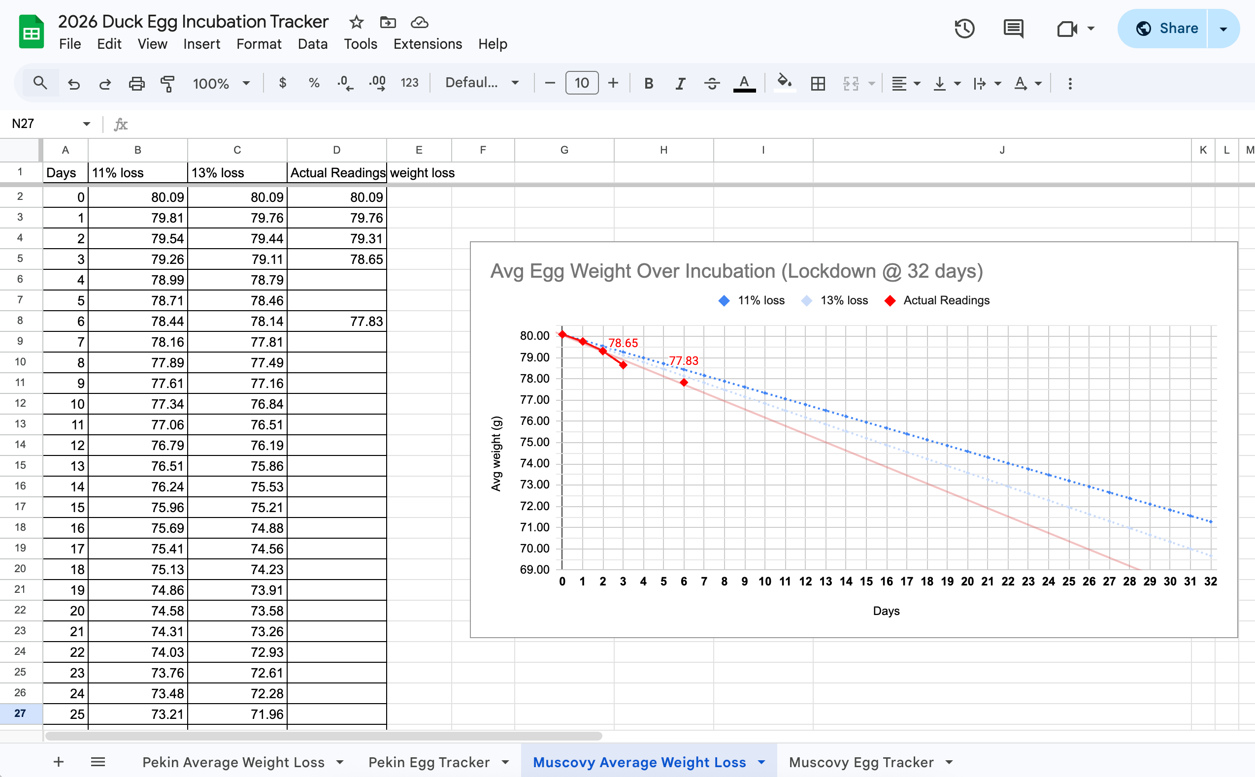 Chart of the Muscovies: At the time of this screenshot, the trend line suggested the eggs were losing moisture a bit too quickly, so the humidity in the incubator had to be increased.