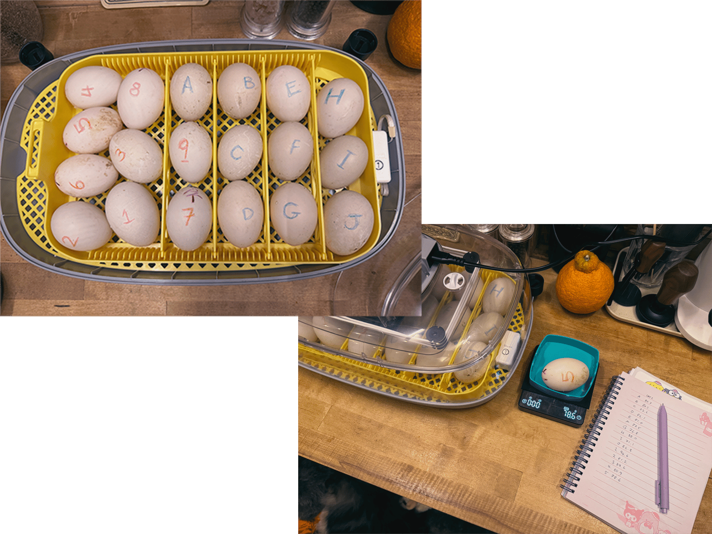 At the start of incubation, I labeled and weighed each egg. As the embryos develop over the coming weeks, the eggs will naturally lose a bit of weight — this is normal and necessary. That weight loss happens because moisture slowly evaporates through the shell, allowing the air pocket inside the egg to grow.